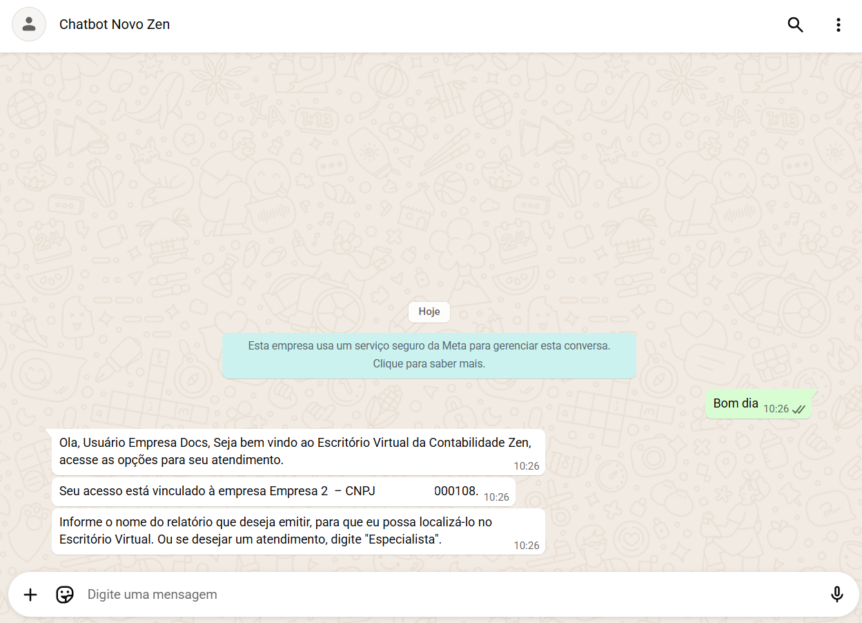 Por padrão, o sistema exibe a seguinte mensagem: Olá, {{nome}}! Seja bem-vindo ao Escritório Virtual da Contabilidade Zen. Acesse as opções para seu atendimento.