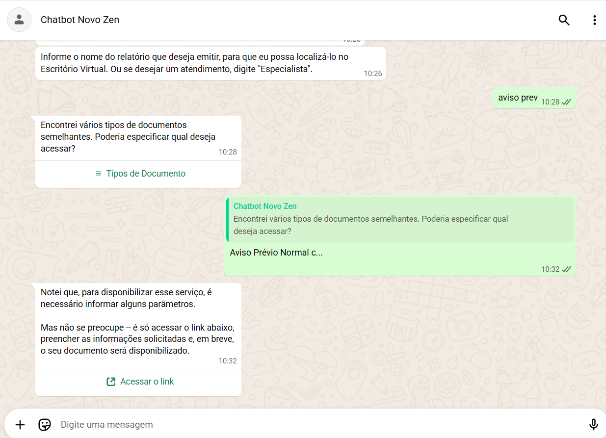 Então, o cliente informará o nome do relatório desejado. Assim, o chatbot compreenderá a solicitação e enviará o relatório correspondente. Caso existam relatórios com o mesmo nome, o sistema enviará uma seleção para que o usuário defina o tipo de documento desejado.