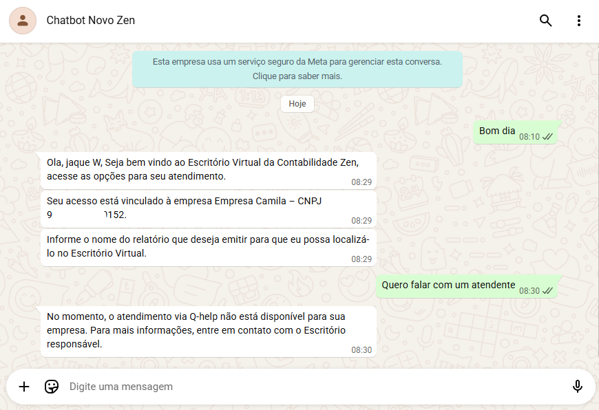 Caso o cliente acione o Chatbot e informe um CNPJ incorreto: Essa opção aparecerá quando o contato tiver acesso a duas ou mais empresas. Nessa situação, o sistema enviará automaticamente a seguinte mensagem: “Ops... Para continuarmos, é preciso escolher um CNPJ válido.”