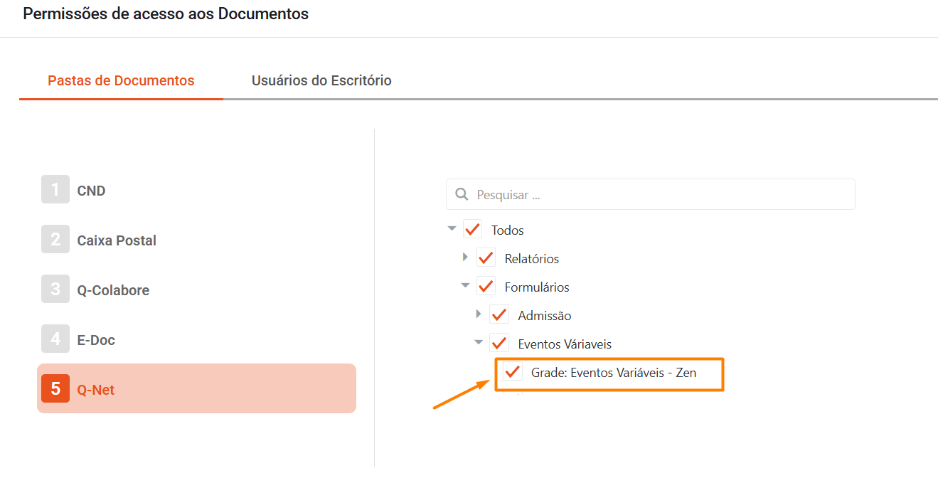 Após acessar o departamento ao qual deseja conceder a permissão de acesso, vá em 5 – Q-Net > Formulários > Eventos Variáveis e marque o checkbox do formulário que foi cadastrado.