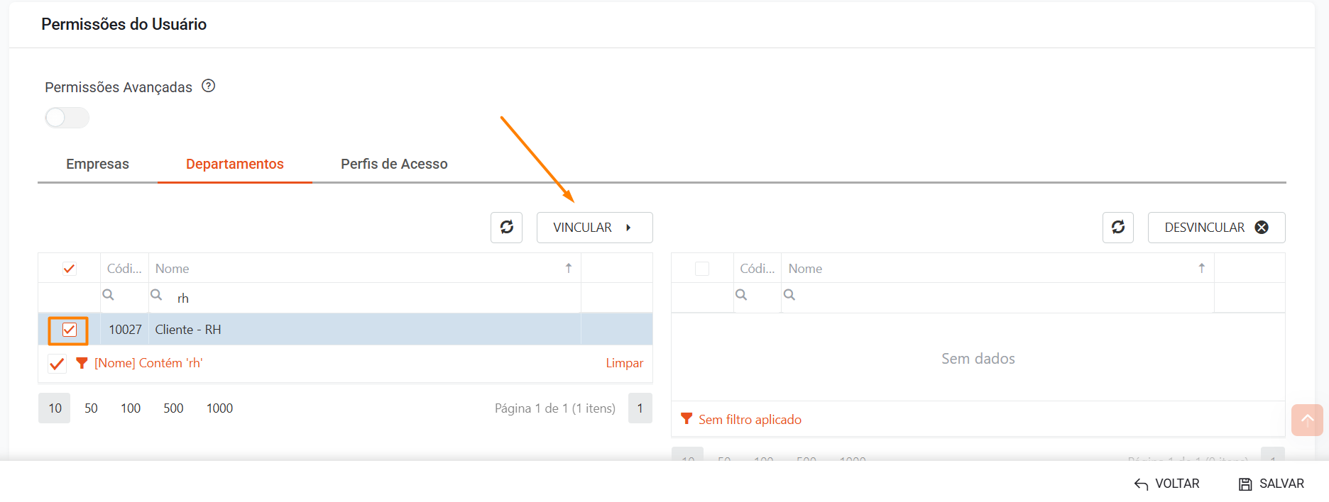 Caso não esteja, marque o checkbox correspondente e clique em Vincular para associar o departamento ao usuário.