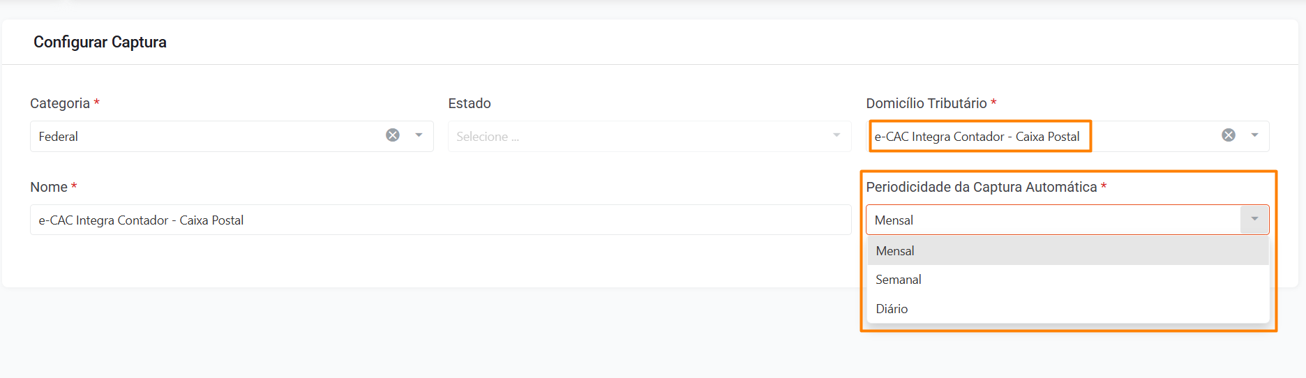 Para configurar o tipo de documento, acesse: Automações > Caixa Postal > Configurar Captura.
