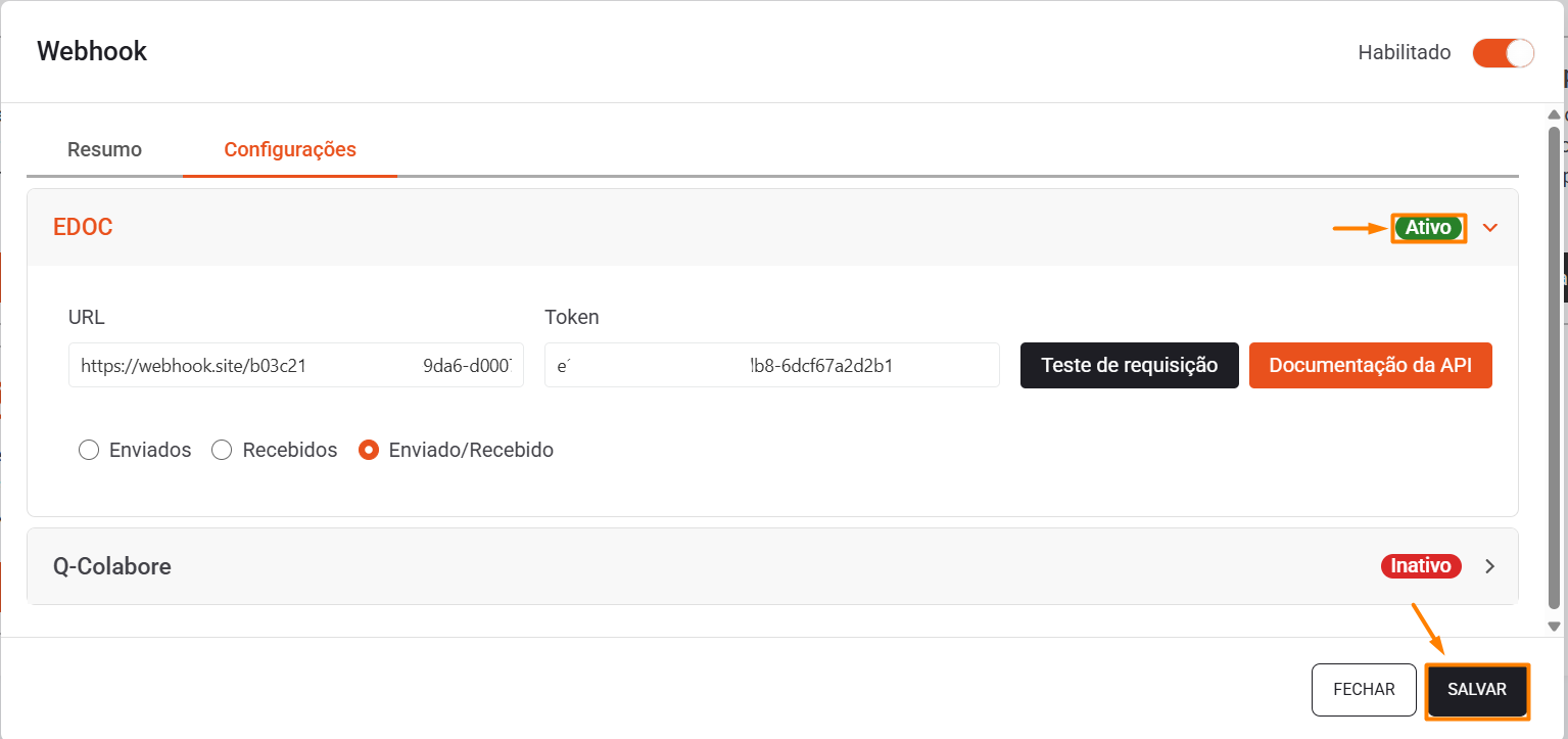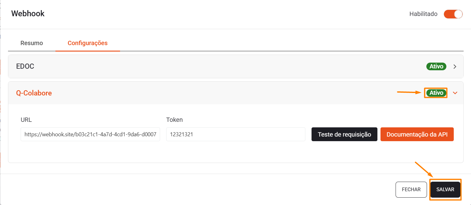 Neste passo, você precisará habilitar o Webhook, clicando sobre o botão Habilitado, conforme a imagem a seguir: