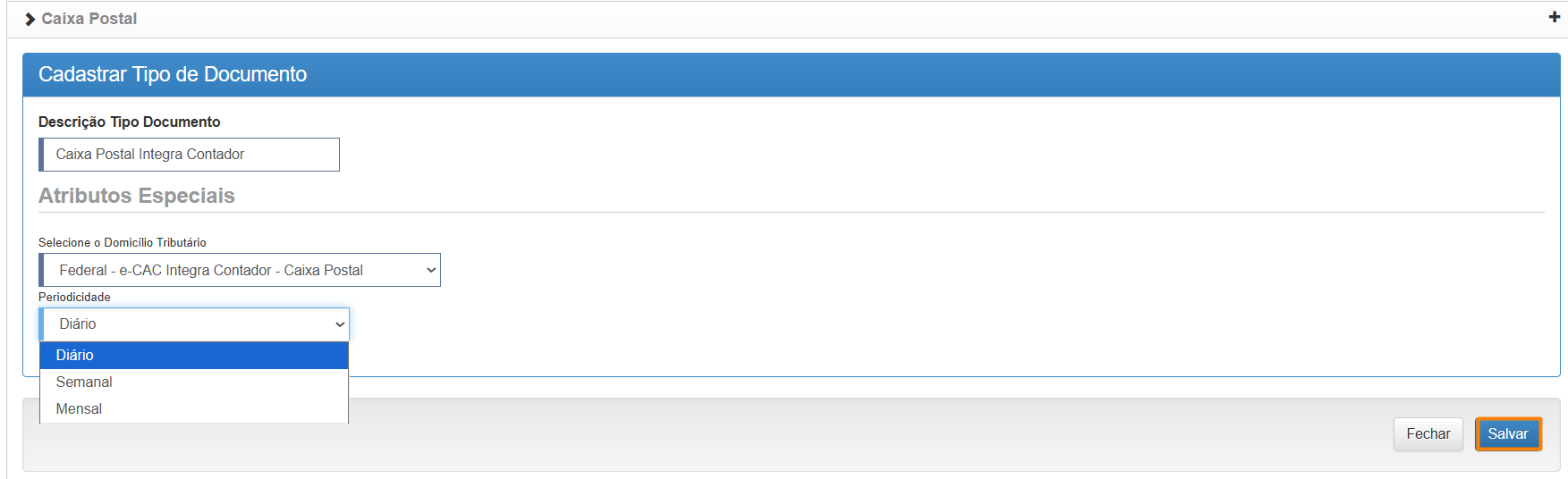 Para configurar o tipo de documento, acesse: Questor Zen > Tipos de Documentos > CND > Caixa Postal.