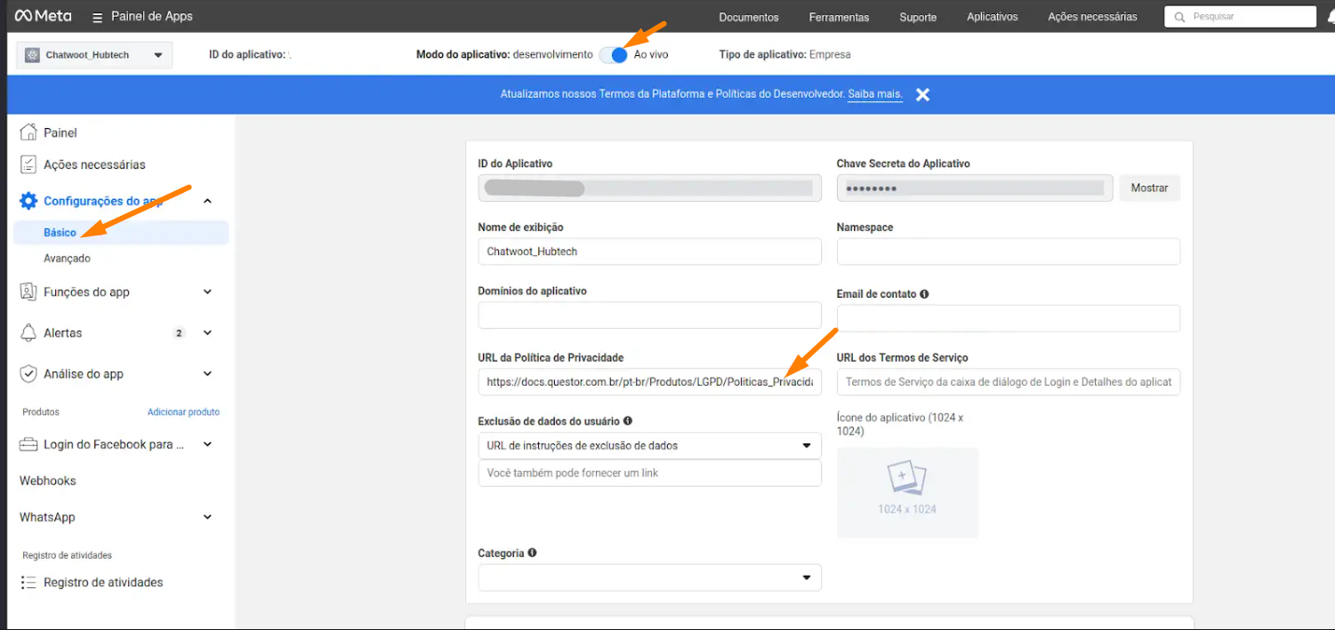 Preencha o campo URL da Politica de Privacidade com o link de politica de privacidade de sua empresa.