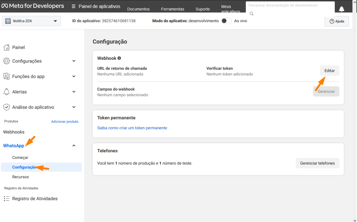 No campo Editar URL de retorno de chamada do webhook, preencha da seguinte forma: URL do ZEN + /whatsappbusiness/webhook/