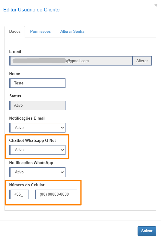 Configure os usuários, inserindo o número de WhatsApp e ativando as notificações no menu CRM > Listar > Detalhes Clientes > Usuários > Editar.