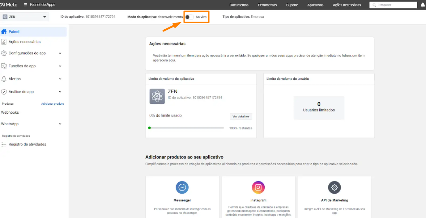 A Meta exige que o aplicativo esteja em modo Ao Vivo para que a resposta do cliente seja retornada corretamente