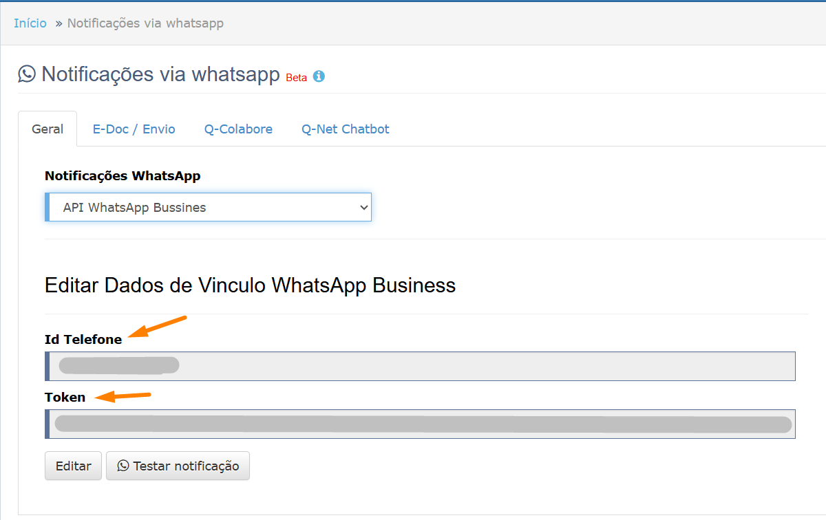 Acesse Configurações > Notificações via WhatsApp e informe o Id Telefone e Token.