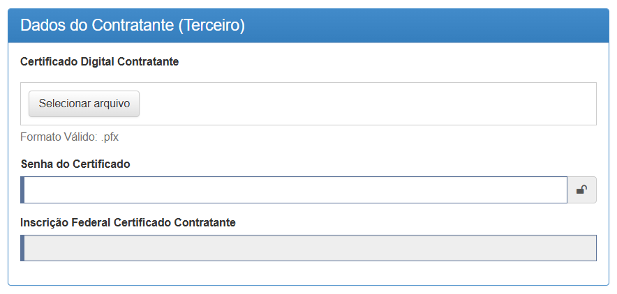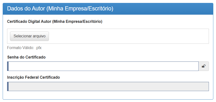 De acordo com a opção selecionada (Minha Empresa/Escritório ou Terceiro), serão exibidos os campos necessários para dar andamento à configuração, como o campo destinado à seleção do certificado digital.