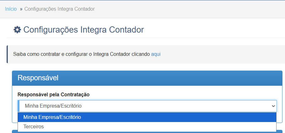 No menu Responsável, selecione se será Minha Empresa/Escritório, quando o responsável pela contratação for o próprio escritório, ou Terceiro, caso a contratação do Integra Contador esteja em nome de outro estabelecimento que não seja o escritório contábil proprietário da base Zen.