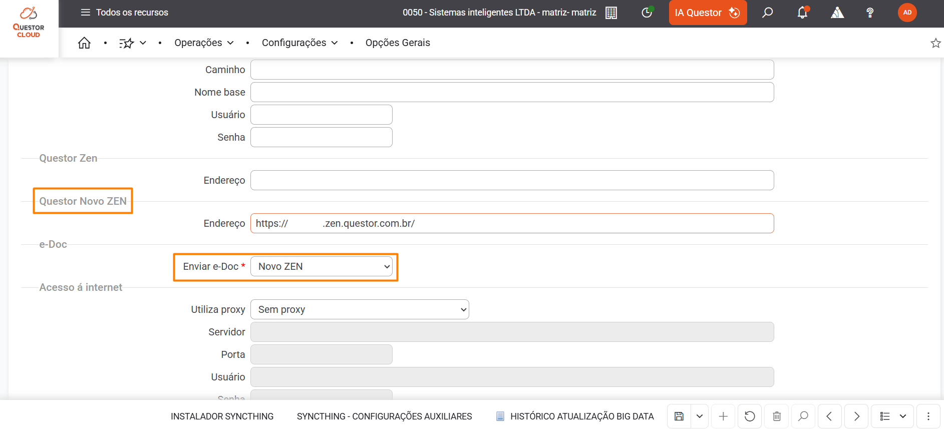 Para que o Questor saiba que deve enviar os documentos do e-Doc para o Novo ZEN, é necessário configurar a URL nas Opções Gerais do sistema. Além disso, na mesma rotina, é preciso selecionar a opção "Novo ZEN" no campo "Enviar e-Doc".