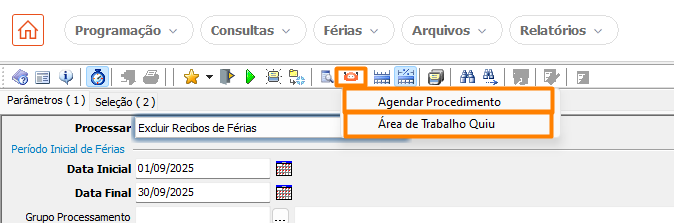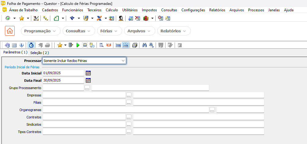 1. Acesse a rotina de Cálculo de Férias Programadas em: Módulo Folha de Pagamento > Áreas de Trabalho > Férias > Cálculo de Férias Programadas.