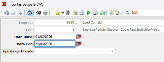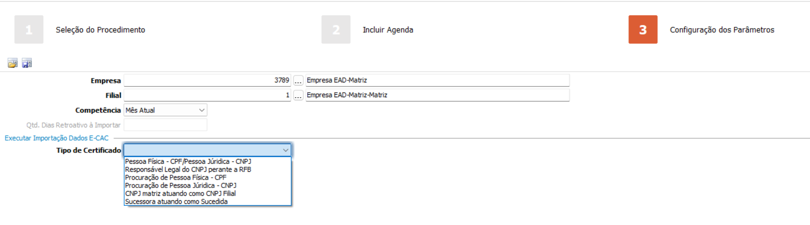 Para utilizar a Importação de Pagamentos pelo e-CAC via agendamento Quiu, é necessário realizar algumas configurações. Primeiro, configure um certificado digital válido para permitir as operações no Portal do e-CAC. Essa configuração deve ser feita na rotina Módulo Gerenciador de Empresas > Cadastros > Certificado Digital > Certificado Outorga.