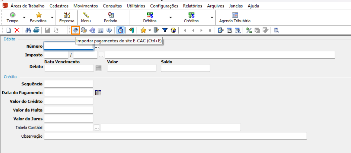 1. Acesse a rotina Importação de Dados E-CAC em Controle de Tributos > Créditos > Federais > Pagamento com DARF.