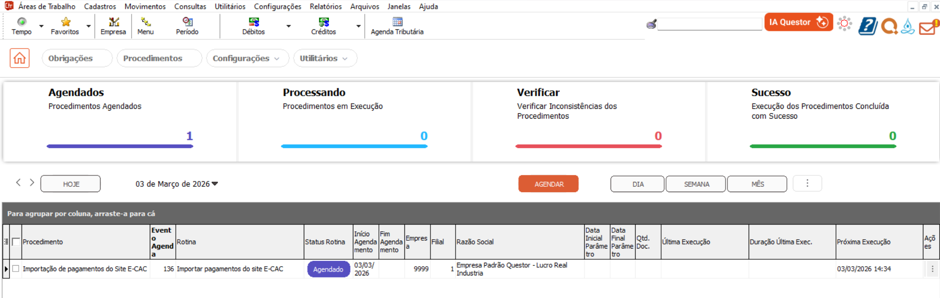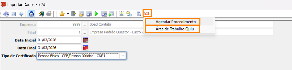 ATENÇÃO! O sucesso do agendamento no Quiu não significa que os pagamentos já foram importados. Isso indica apenas que a API foi acionada para buscar os dados no e-CAC. Por padrão, essa busca ocorre após as 19h, devido à fila de processamento do próprio e-CAC — a não ser que o cliente utilize o Integra Contador, que permite a busca dos pagamentos em tempo real.