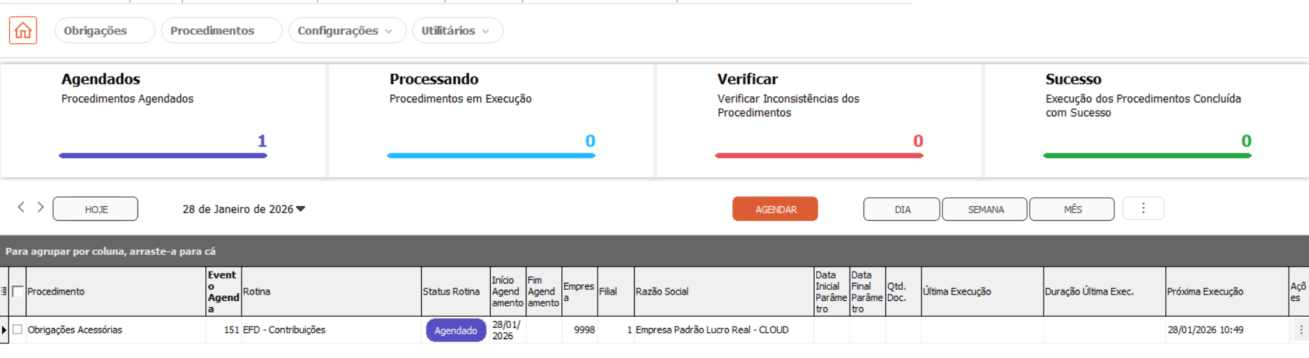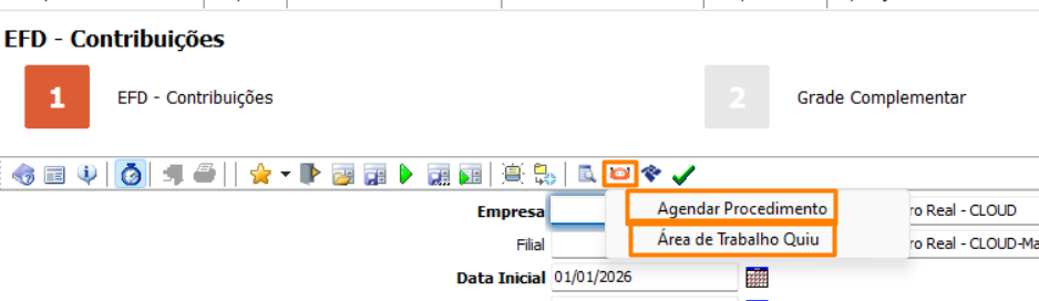 Este processo permite a importação do arquivo EFD Contribuições. Seu acesso se dá através da seguinte rotina: Módulo Fiscal > Áreas de Trabalho > Quiu > Procedimentos > Agendar.