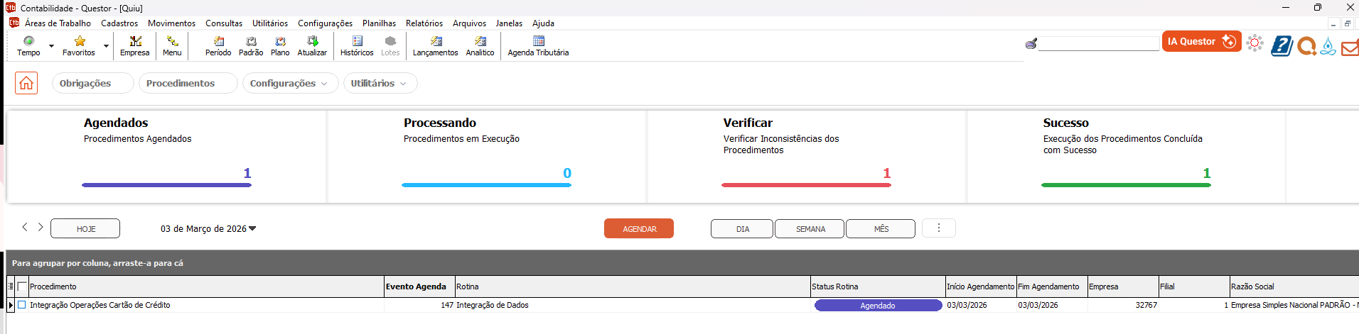 Essa rotina tem o objetivo de integrar as operações do cartão de crédito. Para o agendamento será necessário acessar a rotina: Módulo Contabilidade > Áreas de Trabalho > Quiu > Procedimentos > Agendar.