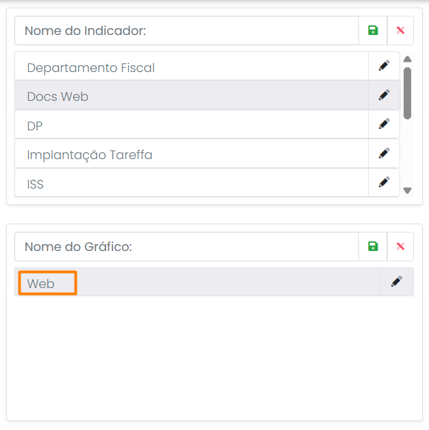 Ao clicar no ícone de lápis, é possível editar o nome do indicador ou do gráfico. Ao clicar no ícone “X”, o indicador ou o gráfico será excluído. Ao clicar no ícone de disquete, o nome do indicador ou do gráfico será salvo.